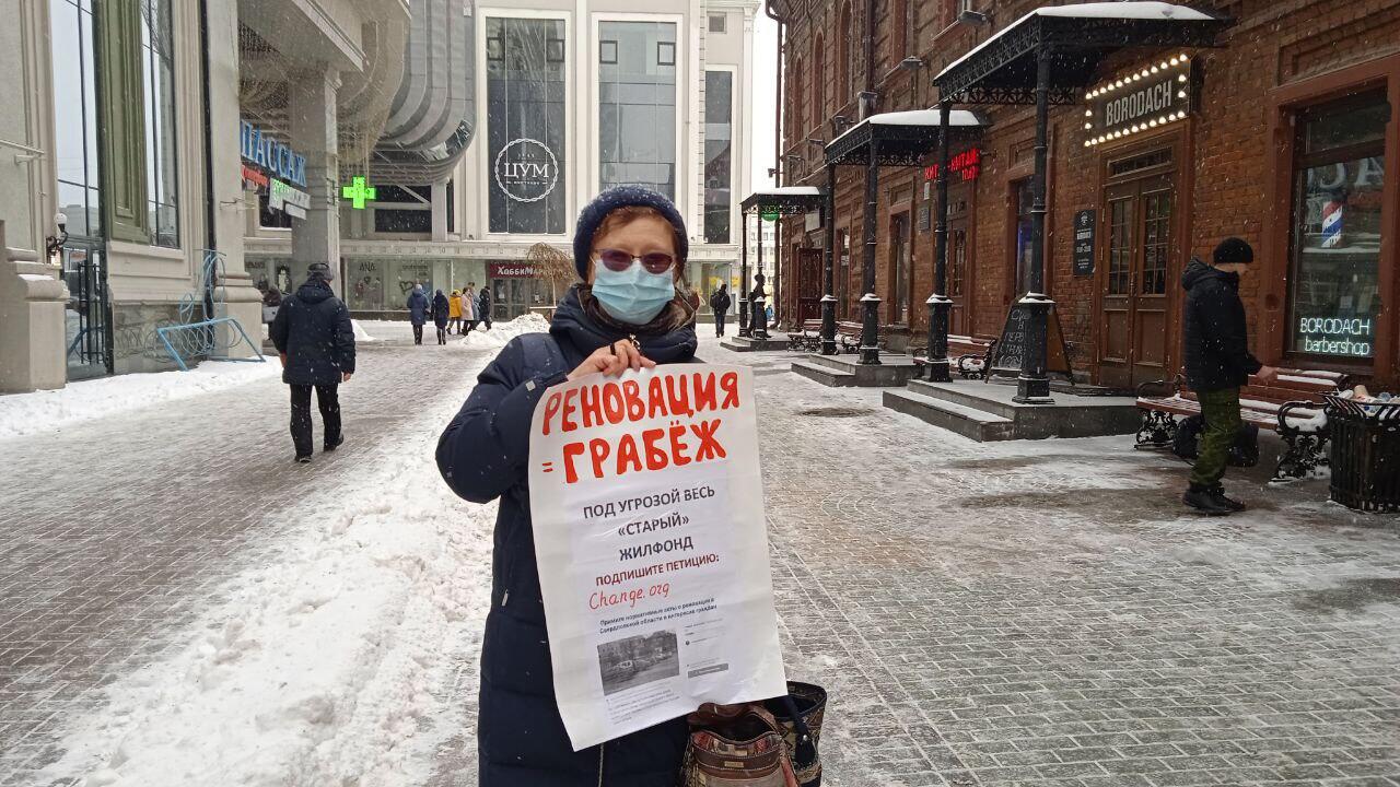 Сегодня в Екатеринбурге прошли два одиночных пикета против закона о комплексном развитии территорий (реновации). Общественница Ирина Саломатова вышла к памятнику Ленину на площадь 1905 года, еще одна активистка движения «Перемен» Татьяна Ярошенко устроила акцию рядом с торговым центром «Пассаж».