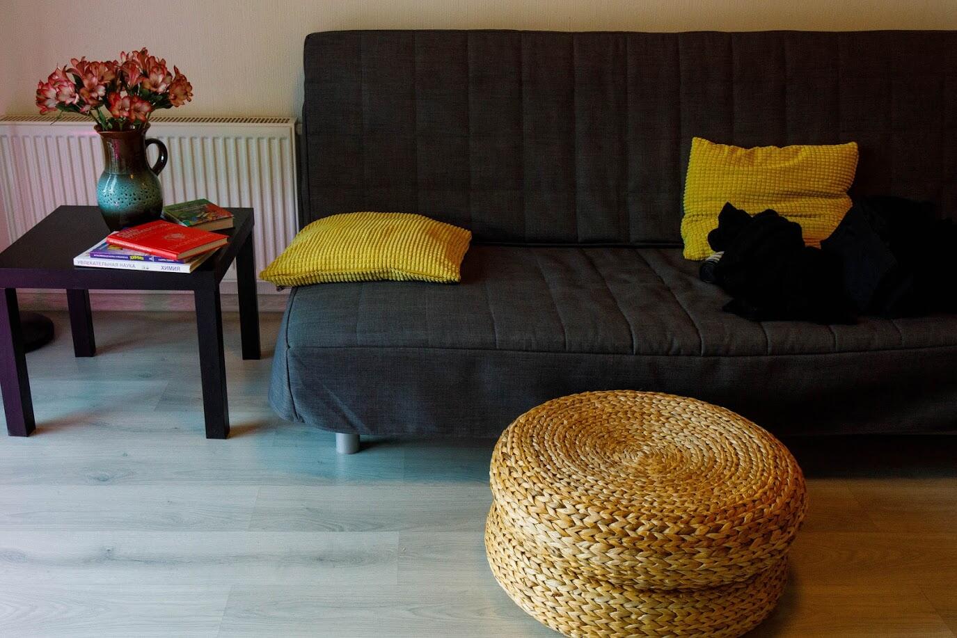 Женя Чайка.На полке у дивана кувшин — у него есть своя история. Год назад Женя принесла его из дома в честь приезда художника из Гамбурга Лукаша Кробок. Кувшин украшал праздничный стол во время субботних обедов (на сайте арт-резиденции можно посмотреть, как это происходило — прим. ред.), которые резидент проводил для гостей. Затем какое-то время в нем рос бамбук, который принесла кураторка Аня Литовских. Она нашла его во время одной из прогулок по Уктусу — засохшее растение просто кто-то выбросил. Аня спасла его, а гости резиденции разобрали ростки домой. Теперь этот бамбук можно найти в разных уголках страны. Наташа Подунова поставила в кувшин живые цветы.