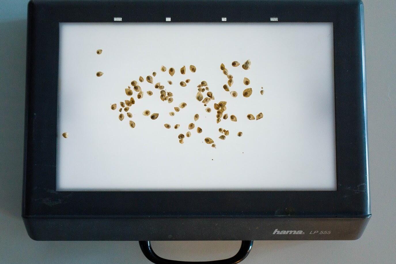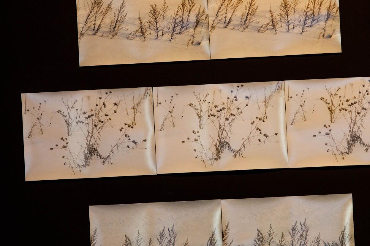 Пока мы видим только часть фотографий — это одна форма экспозиции. Вторая — семейный альбом, в котором каждый этап жизни растения запечатлен на отдельном развороте. Его уже можно посмотреть. В списке объектов исследования 12 растений. Есть, например, иван-чай, бессмертник, пижма. Подходим к диптиху и триптиху.
