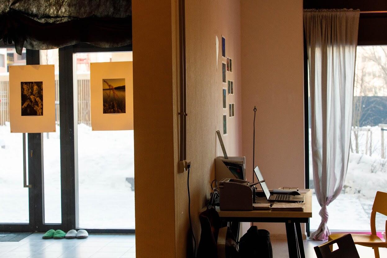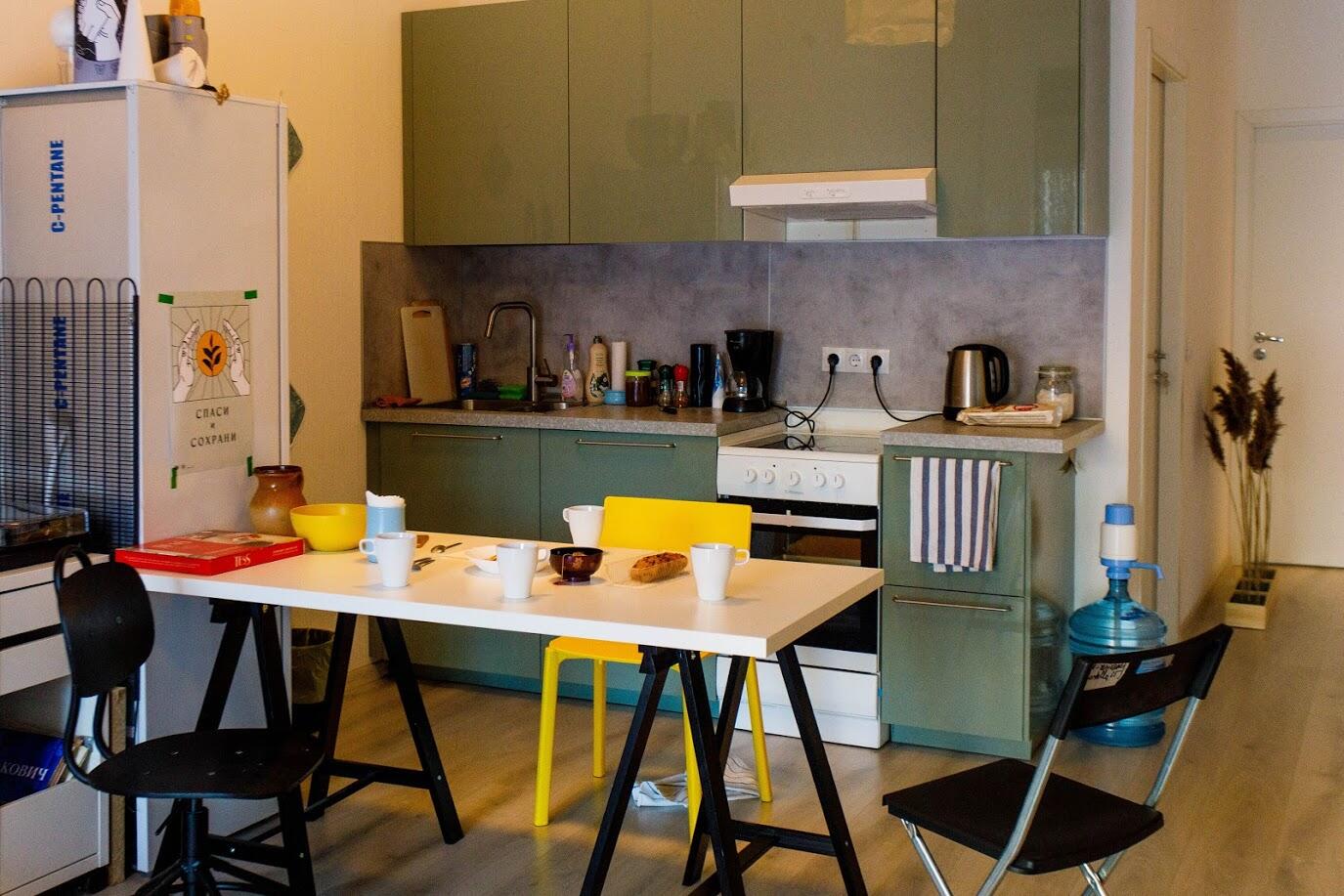 Наташа ставит передо мной чай, а я пытаюсь понять, где нахожусь. В галерее, в мастерской художника или у нее дома? Мои размышления прерывает куратор арт-резиденции Женя Чайка. Она садится к нам и начинает рассказывать: в любой арт-резиденции есть художественная и бытовая часть. Каждый художник меняет пространство «под себя» и оставляет свои следы. На холодильнике можно увидеть плакаты, магниты, стикеры от Ани и Виталия Черепановых, Сергея Потеряева, Ильи Гришанова, Анастасии Богомоловой.