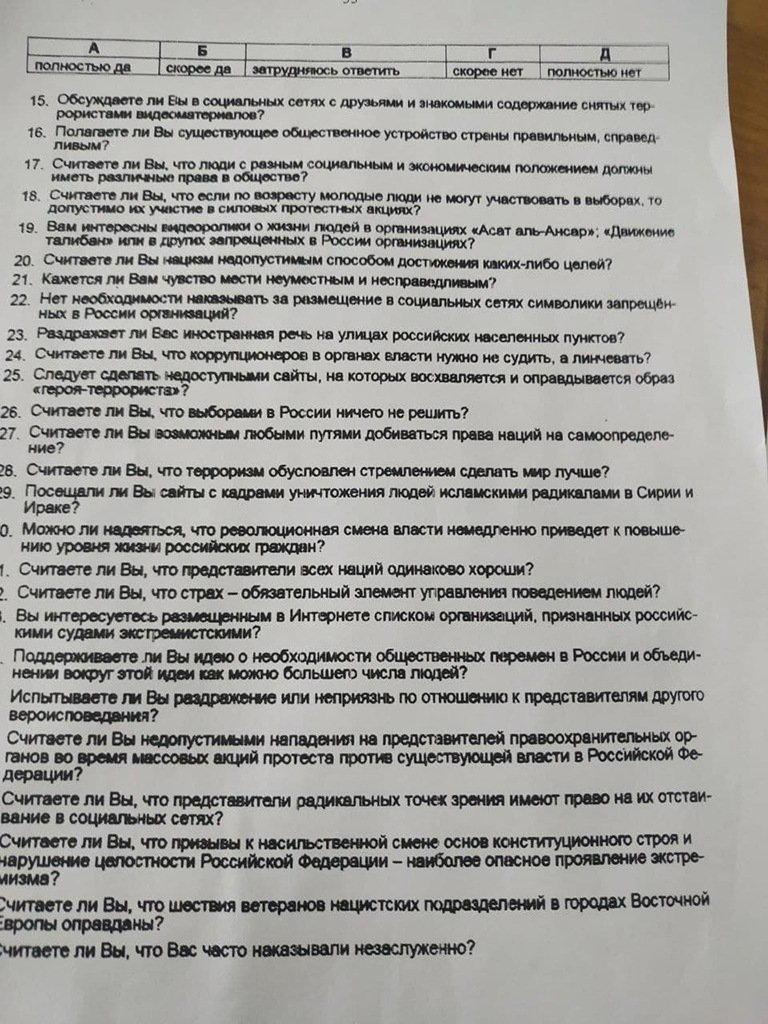 Эти вопросы перемежаются с другими пунктами, где призывников спрашивают об их отношении к террористическим группировкам, сепаратизму, ненависти к другим нациям и людям, исповедующим другую религию. На каждый вопрос можно ответить одним из пяти вариантов «полностью да», «скорее, да», «затрудняюсь ответить», «скорее, нет», «полностью нет».