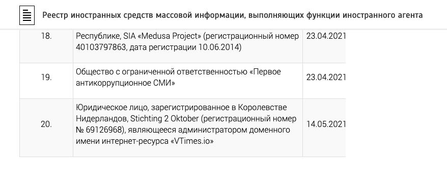 В дополненный список иноагентов попало юридическое лицо из Нидерландов Stichting 2 Oktober, которое администрирует сайт издания VTimes.io.