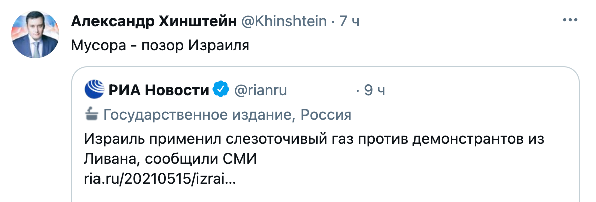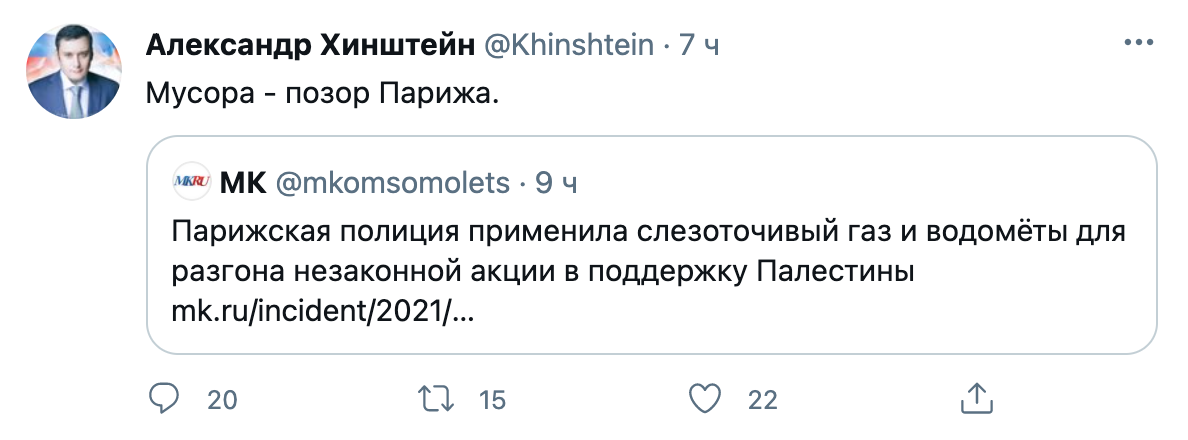 «Мусора — позор Израиля» и «Мусора — позор Парижа», минувшей ночью написал в своем Twitter председатель комитета по информационной политике Госдумы Александр Хинштейн. Два твита комментируют ссылки на публикации о действиях силовиков двух стран по разгону акций в поддержку Палестины. В первом случае речь идет о применении слезоточивого газа против демонстрантов из Ливана, во втором — про разгон антиизраильской акции в Париже.