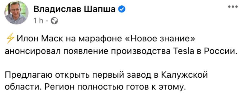 Сразу после его заявления российские губернаторы в социальных сетях принялись просить Маска открыть завод Tesla именно в их регионе. В очередь выстроились глава Московской области Андрей Воробьев и калужский губернатор Владислав Шапша. А глава Удмуртии Александр Бречалов предложил Маску налоговые льготы.
