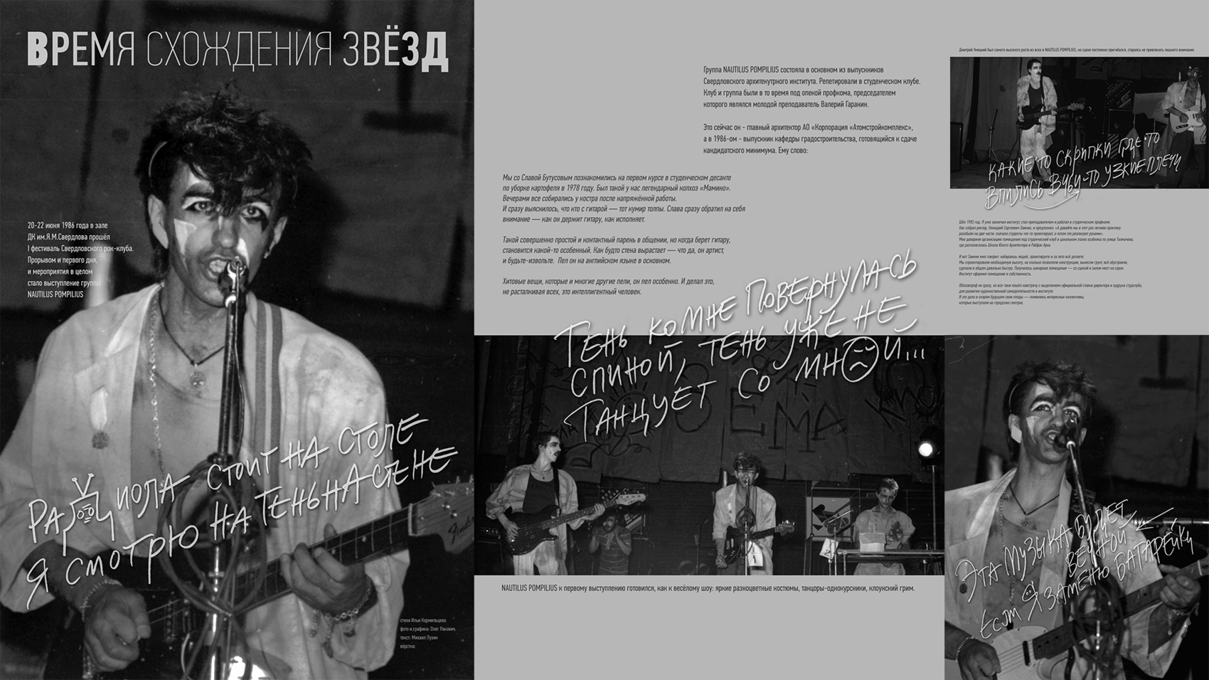 Ровно 35 лет назад в Свердловске прошел первый фестиваль Свердловского рок- клуба. На мероприятии, которое называли «творческой мастерской», отличилась группа Nautilus Pompilius. У музыкантов, в основном выпускников Свердловского архитектурного института, были необычные костюмы. Группу опекал и продюсировал молодой преподаватель Валерий Гаранин. Во многом именно благодаря ему у музыкантов была своя репетиционная база, тексты песен были залитованы и «Наутилусы» могли свободно выступать.