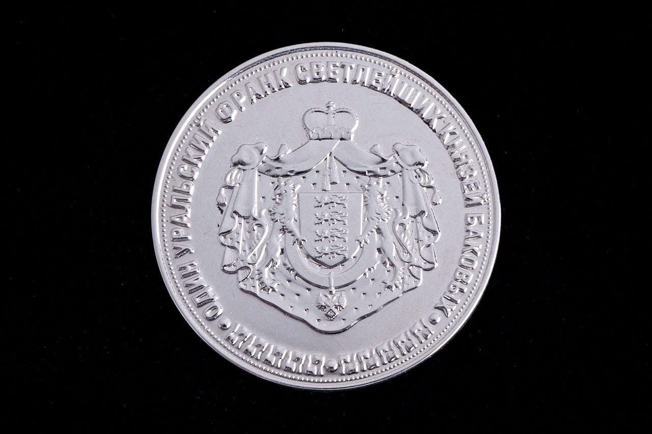 Монета уральского франка изготовлена из серебра 925 пробы, весит 20 граммов. На гурте выгравирован номер монеты. На аверсе надпись «Богдашка Топорок. Частные деньги», на реверсе — «Один уральский франк светлейших князей Баковых». Богдашкой Топорком звали предка Антона Бакова, жившего на Урале в конце XVI — начале XVII века.
