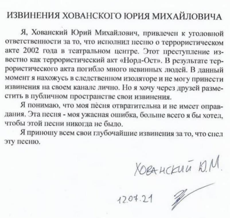 Блогер Юрий Хованский, который находится под арестом, публично извинился за песню про «Норд-Ост», из-за которой его обвинили в оправдании терроризма. Извинения блогера опубликовал ютубер Илья Мэддисон.