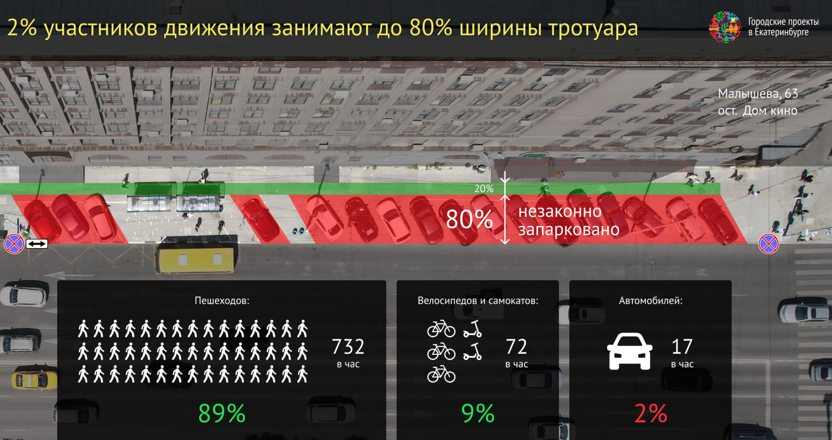 В ходе исследования активисты считали пешеходов, велосипедистов, самокатчиков, пассажиров общественного транспорта, а также количество припаркованных автомобилей, мешающих людям. Они пришли к нескольким выводам.