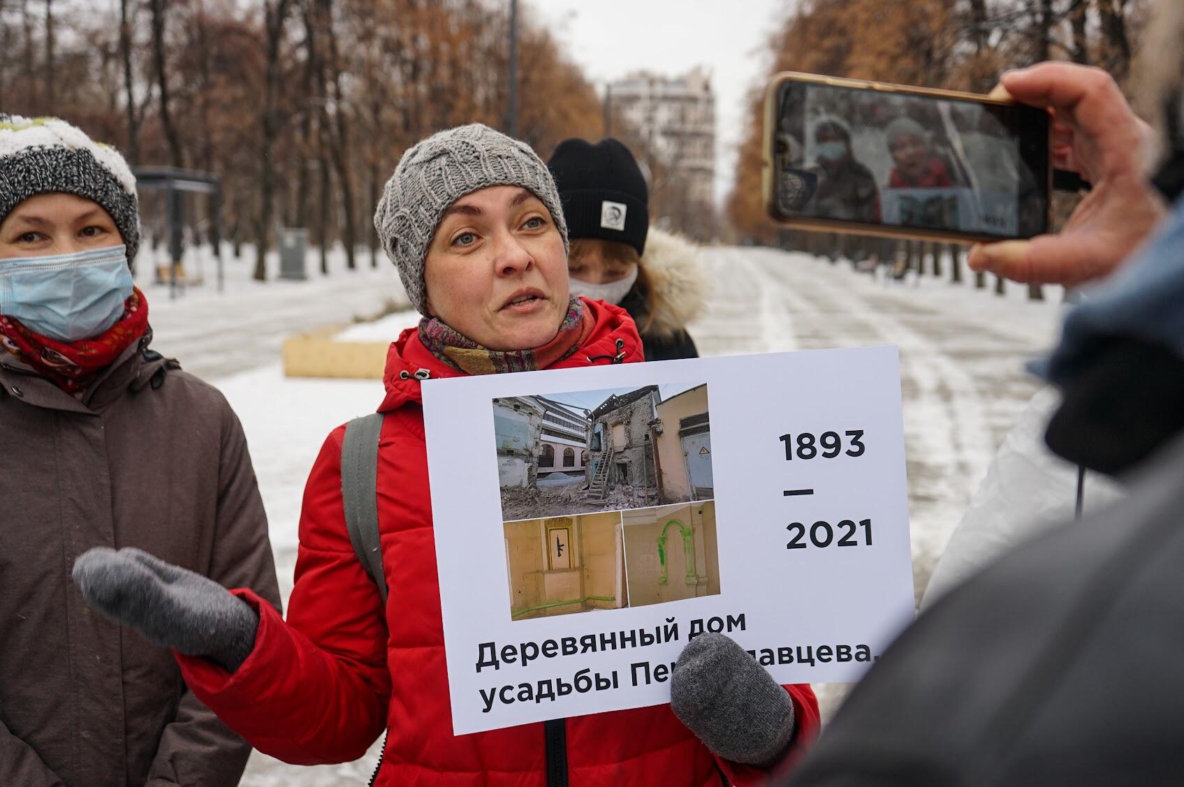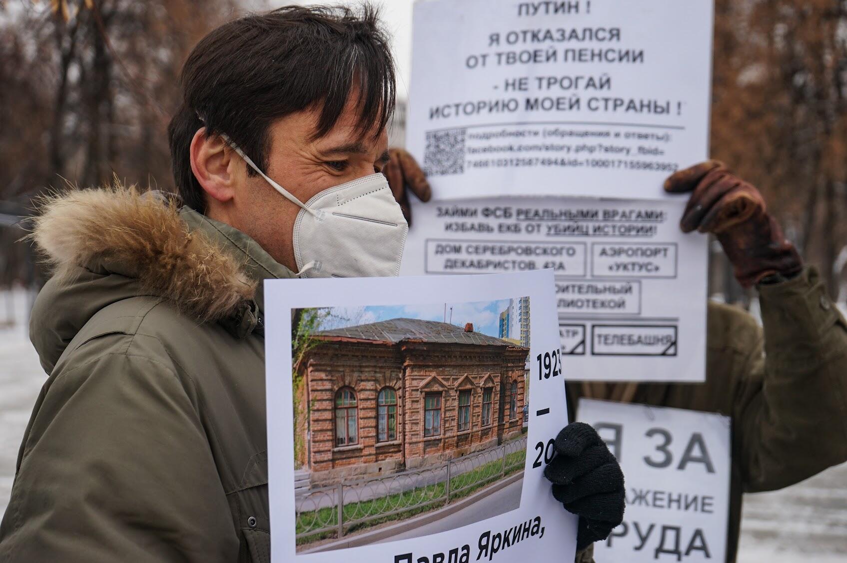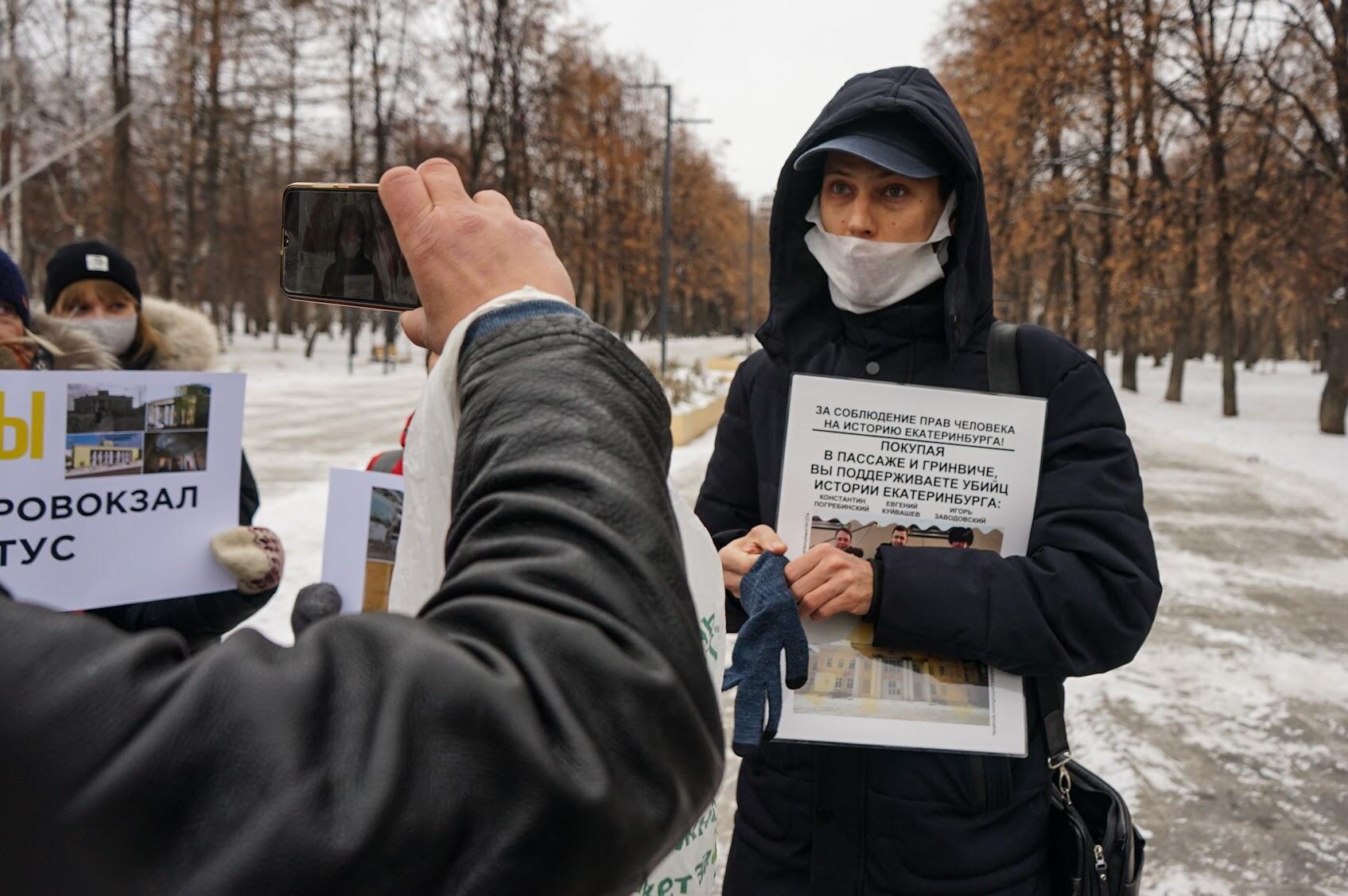 Около 20 жителей Екатеринбурга вышли на акцию протеста против сноса исторических зданий города. В руках они держали плакаты с фотографиями объектов, которые уже исчезли или находятся под угрозой исчезновения.
