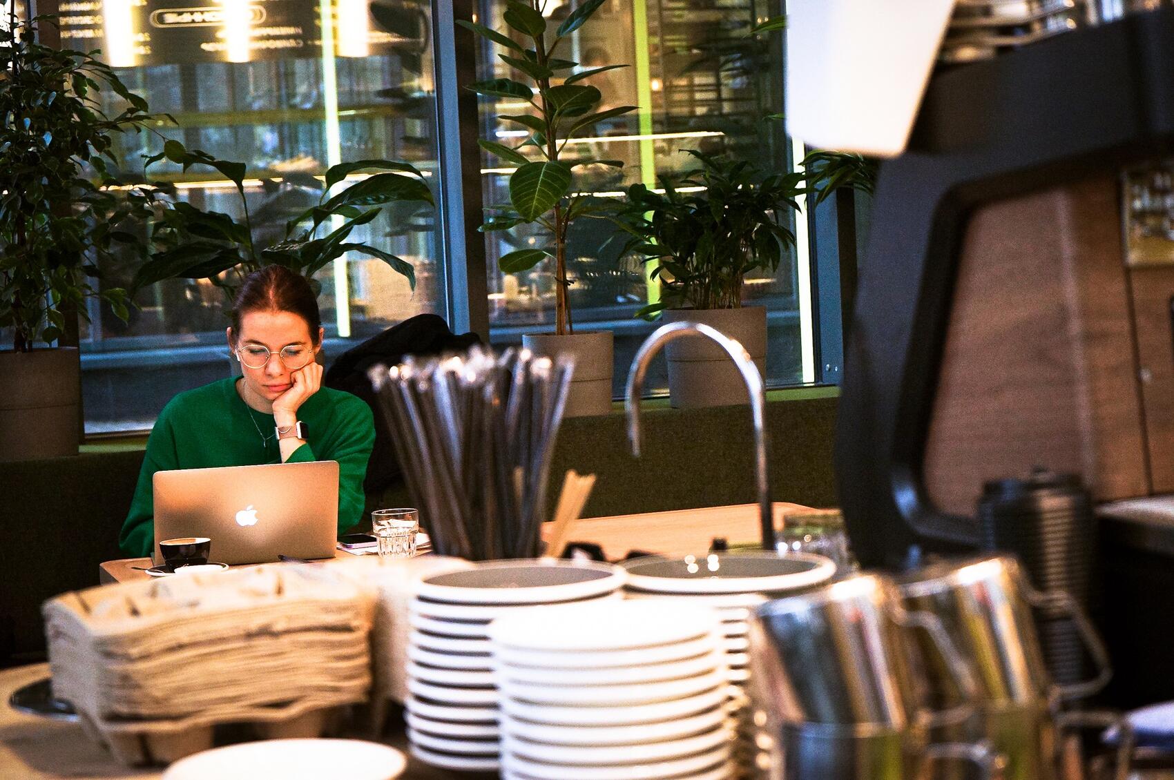 Напротив витрины и барной стойки — мягкая зона с уютными диванчиками на 30 мест. Здесь можно устроиться поработать или попить кофе с другом. Весь интерьер «дышит» зеленым в разных оттенках. Он насыщен деревом, а декор в виде реек отсылает к орнаменту самого жилого комплекса.