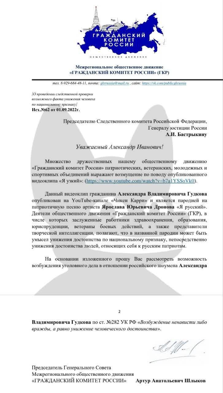 Движение «Гражданский комитет России» (ГКР) попросило главу СКР Александра Бастрыкина проверить клип комика Александра Гудкова «Я узкий» на экстремизм. Видео Гудкова пародирует клип на песню «Я русский» финалиста шоу «Голос» музыканта Shaman (Ярослав Дронов). Скриншот обращения активистов к главе СК опубликовала Ксения Собчак.