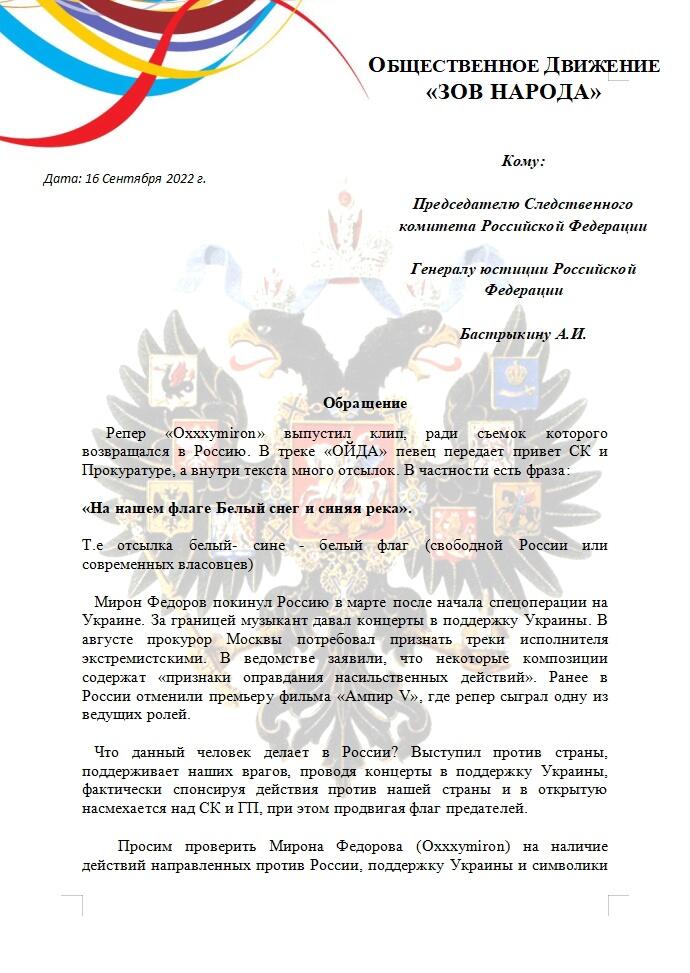 На рэпера Оксимирона (Мирона Федорова) пожаловались председателю Следственного комитета РФ Александру Бастрыкину из-за признаков «экстремизма» в новом клипе музыканта «ОЙДА». Обращение появилось в социальных сетях движения «Зов Народа» в день публикации видео.