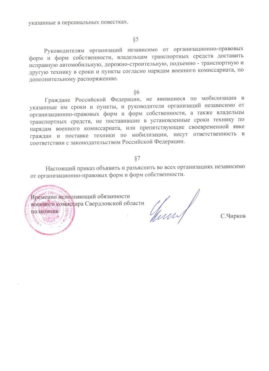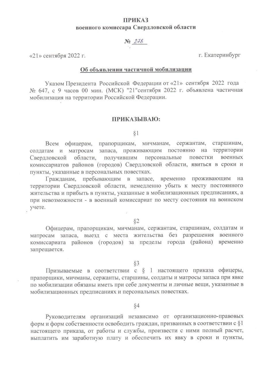 Военный комиссариат Свердловской области опубликовал приказ об объявлении частичной мобилизации в регионе. Документ подписал врио военного комиссара Свердловской области Сергей Чирков. Согласно приказу, опубликованному на сайте ведомства, все офицеры, прапорщики, мичманы, сержанты, старшины, солдаты и матросы запаса обязаны явиться в военкоматы, если они получили персональные повестки.