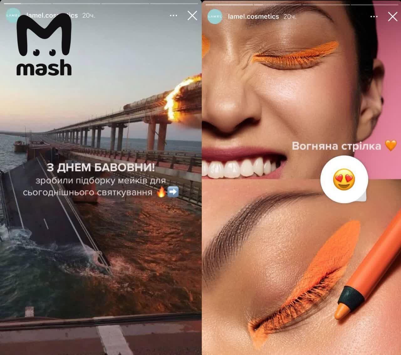 8 октября на Крымском мосту начался пожар из-за взрыва грузовика, были повреждены два пролета автомобильной части конструкции. В соцсетях можно было увидеть эпичные кадры пожара, которые публиковали СМИ и паблики. Бренд косметики Lamel тоже опубликовал подборку снимков ЧП. Их сопроводили подписью «С днем взрыва» и предложили пользователям делать «огненные стрелки». После этого 9 октября продукцию бренда сняли с продаж в сети магазинов «Золотое яблоко.