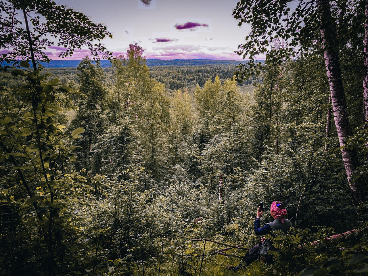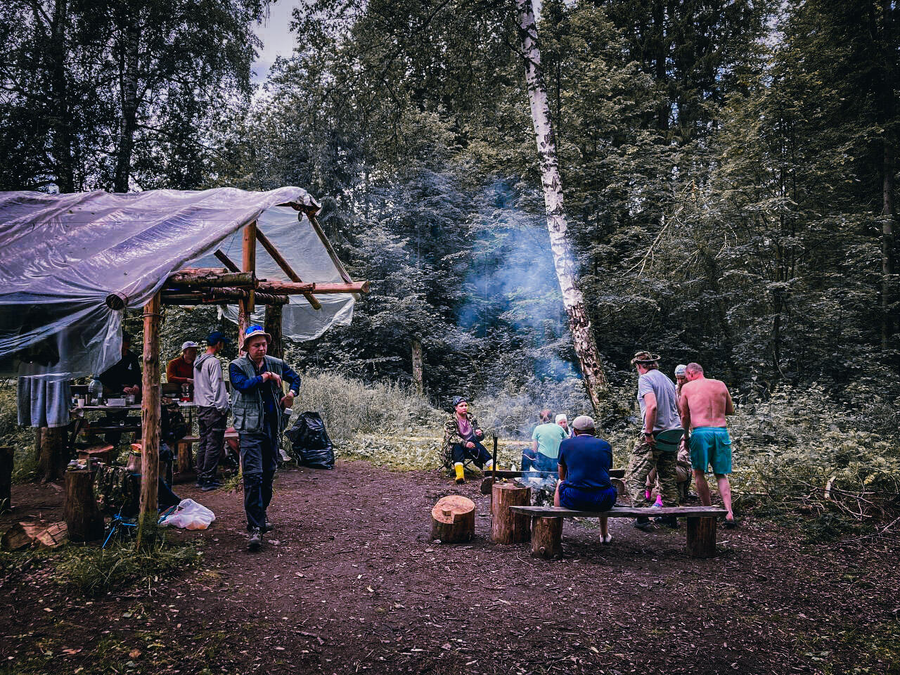 Мы ходим от одного места к другому, регулярно останавливаясь и снимая друг с друга клещей — за всю поездку только с меня не сняли ни одного, хотя с некоторых снимали по штук 20 за день. Смотрим «Поляну озоновых кругов», где в овраге растет много сладкой земляники, «Поляну ужасов», где обычно происходят неприятные истории и в целом считается, что здесь жуткая атмосфера, «Астральную поляну», где мой напарник Саша даже пытается помедитировать, чтобы как-то оправдать ее название, поляну «Линза», которая названа так, потому что выглядит как ровный круг с возвышенностью посередине.