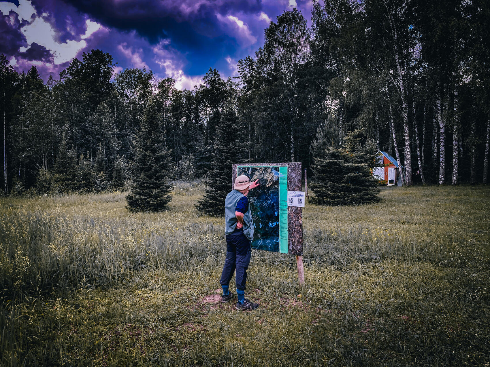 Некоторые точки находятся в отдалении. Например, «космодром» — наш путь до него и обратно занял почти целый день. Считается, что именно здесь приземлился первый замеченный объект, то есть отсюда и началась история «зоны». Мы идем через дикий уральский лес: то пересекаем поля, где трава мне по плечи, то идем в грязи по бездорожью, то выходим на старые тропы между разных деревьев, видим сросшиеся березу, липу и ель.