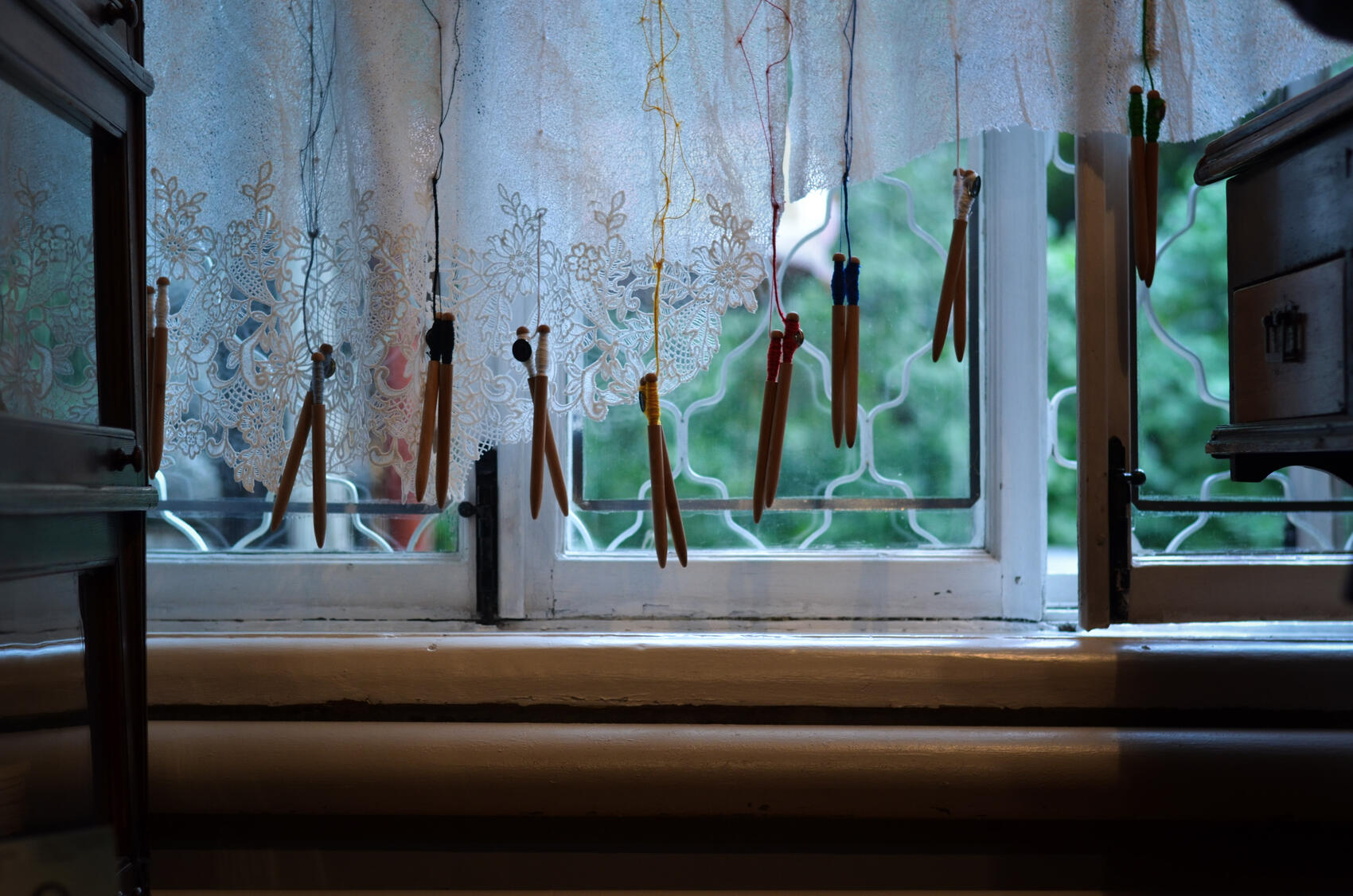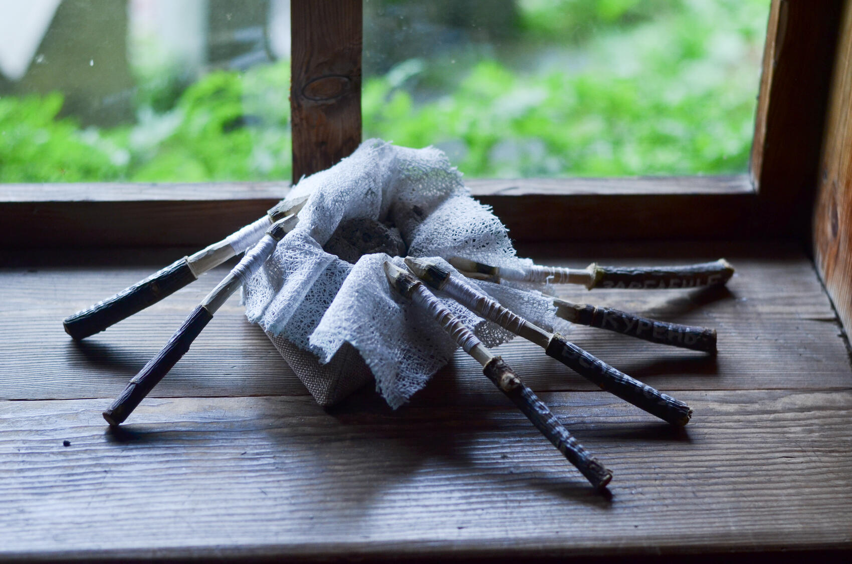 Одну из инсталляций «Узелки памяти» можно увидеть в Музее Паши Бажова в Сысерти (ул. Володарского, 16). Это арт-объекты, сделанные из кружевного полотна, к которому прикреплены деревянные палочки-коклюшки, на которые наматывают нитки для плетения кружева. На палочках можно прочитать странные слова: «панок», «цирла», «батун», «огневать», «ербеза».