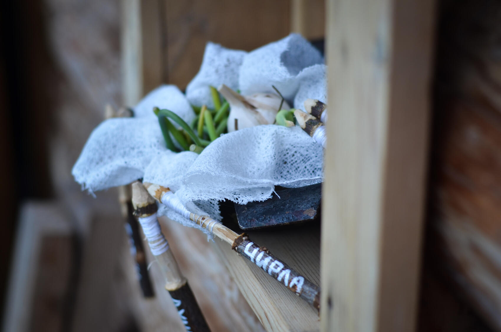 Арт-объекты разбросаны по всей территории дома родителей Павла Бажова. Например, на коклюшках на узелке, который находится в повозке, написаны слова, связанные с дорогой и поездками. Здесь же можно послушать истории о перемещениях, путешествиями Бажова и его современников. На узелке рядом с печью можно прочитать слова, связанные с едой и готовкой, и послушать выжимки из писем Бажова, где он писал о своих кулинарных предпочтениях.