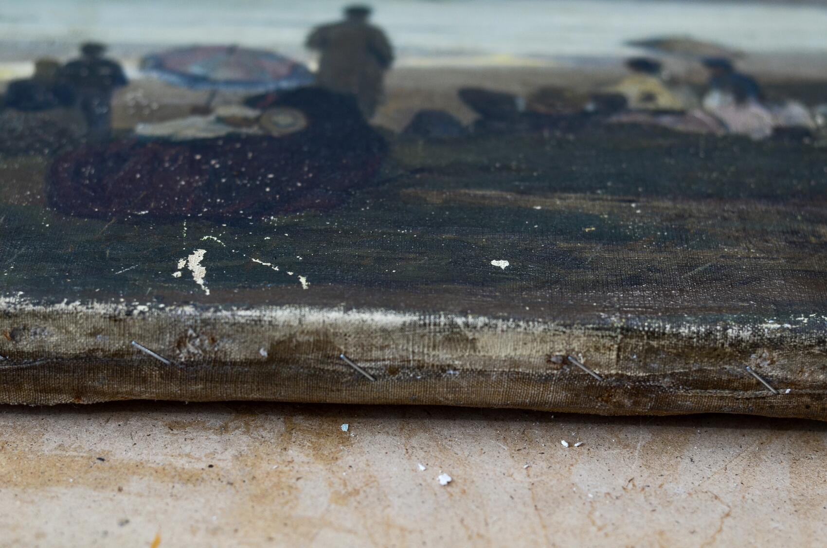 Например, картина может быть написана на шторе. У нас была в реставрации вещь, написанная на задней стороне дермантина, которым, видимо, когда-то была обита дверь. Или подрамники, сколоченные из найденных бог знает где реек и кусков ДСП.