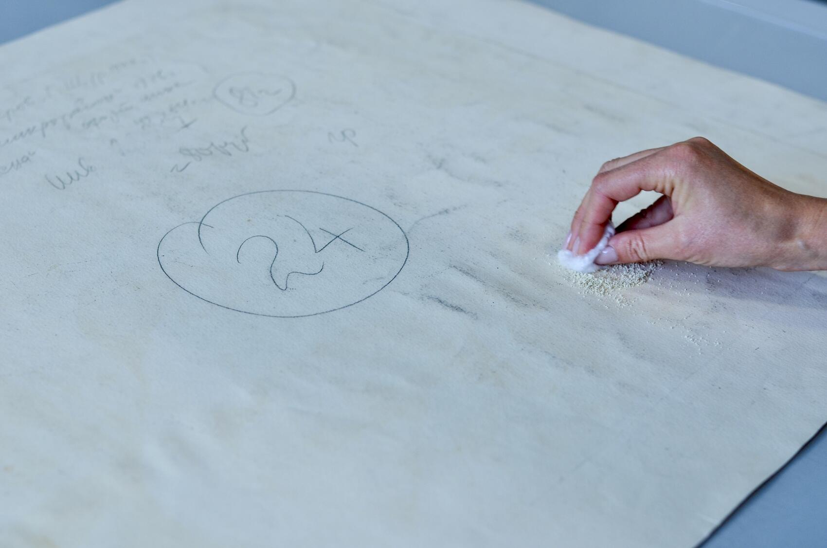 — Мы подбираем крошку по структуре бумаги, по мягкости и жесткости. А какие-то более детальные, втертые загрязнения убираем специальными губками и ластиками. Пользуемся скальпелями для удаления мелких загрязнений, например, в виде фрагментов клея или других налипаний, — объясняет Мария.