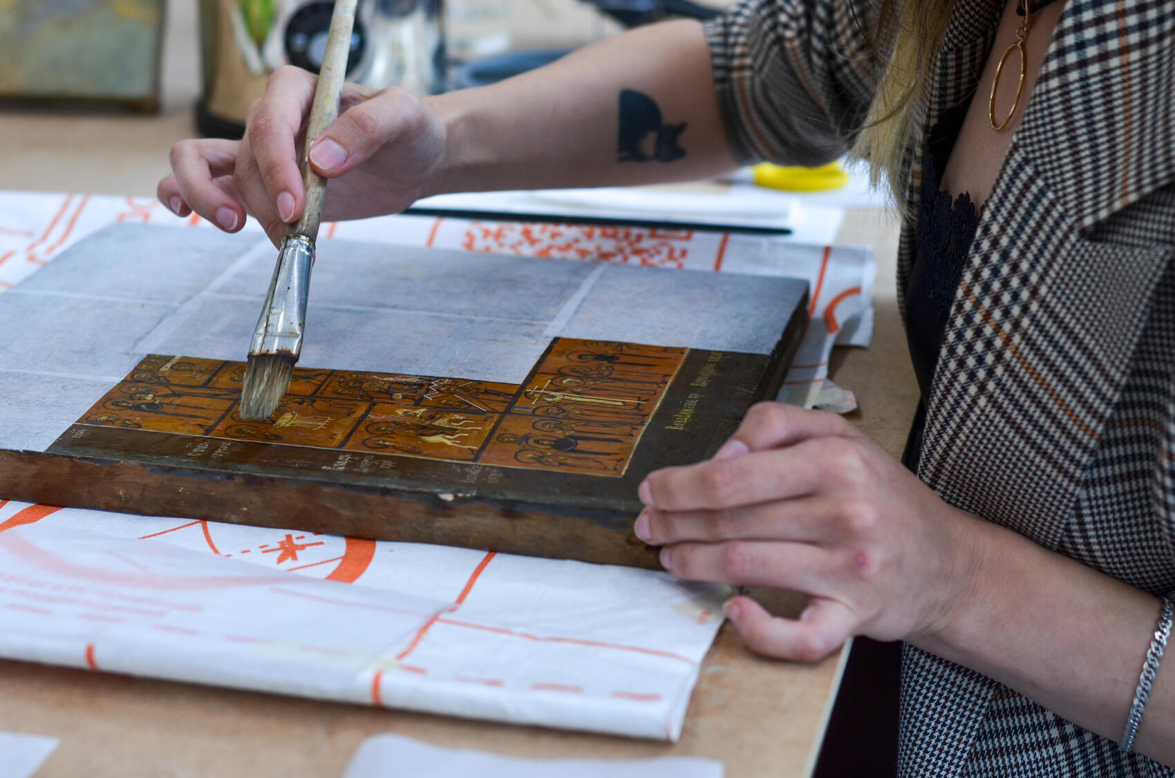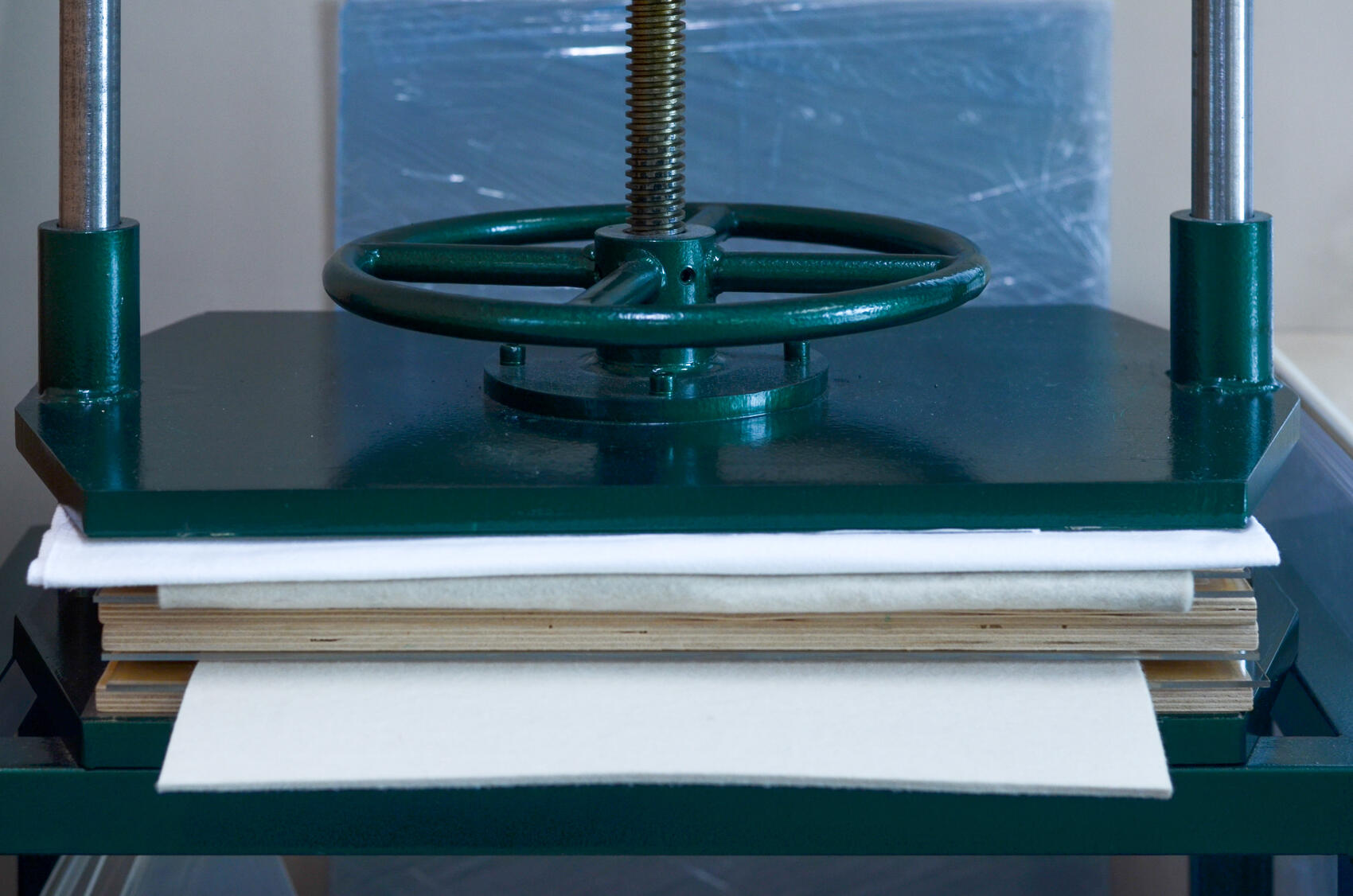 На последнем этапе реставрации лист прессуется. Он может лежать под грузом до двух месяцев, чтобы ослабить деформацию бумаги.