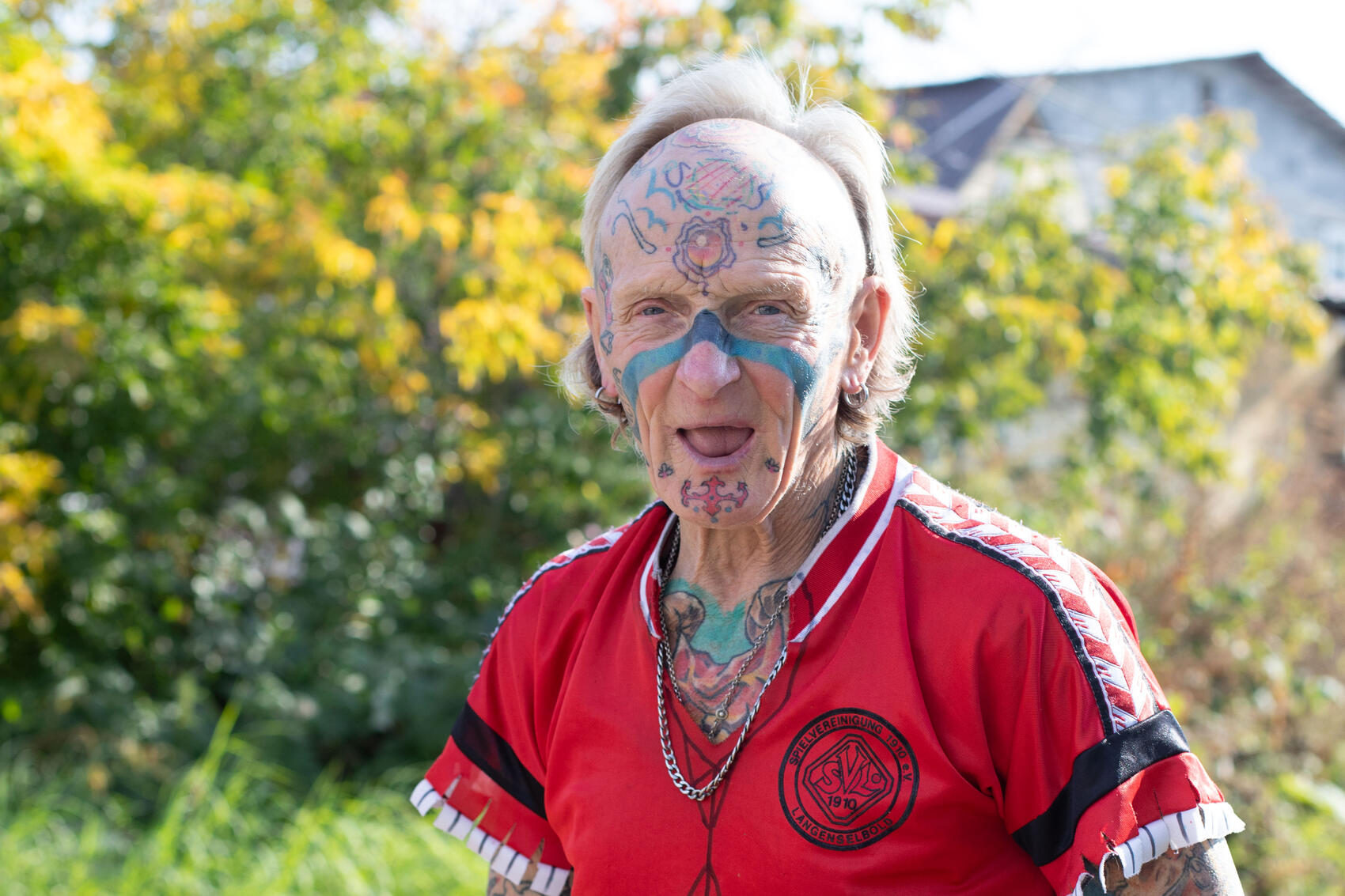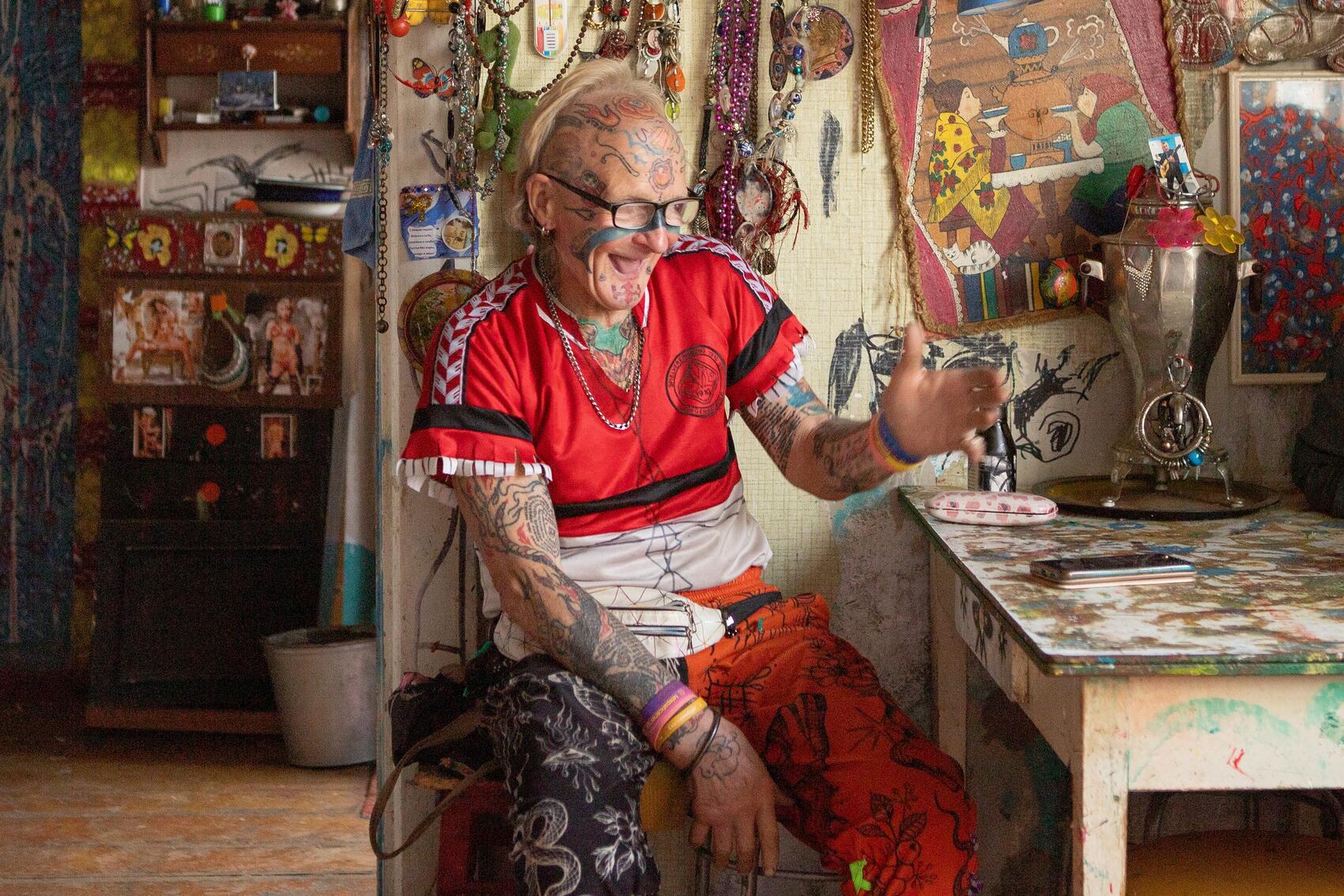 Из разукрашенной избушки к нам выходит такой же разукрашенный мужчина. Все его тело в татуировках, светло-голубые глаза бегают туда-сюда, ни на чем не фокусируясь, такая же расфокусированная и его речь. Спартаку за семьдесят, у него совсем нет зубов, он одет в пеструю одежду, шнурки кроссовок украшают разноцветные веревочки, а на пальце у него стеклянный перстень, имитирующий глазное яблоко.