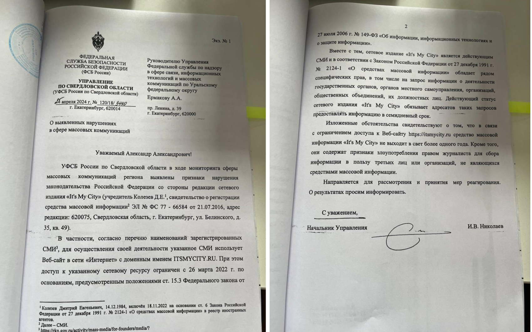 Обращение в Роскомнадзор направил начальник управления ФСБ по Свердловской области Игорь Николаев. Он указал, что сайт It’s My City заблокировали 26 марта 2022 года и якобы с тех пор наше издание официально не выходит в свет, но пользуется правами СМИ. Например, может отправлять запросы в госорганы и получать ответы от них в течение семи дней. В письме Николаев также добавил, что It’s My City злоупотребляет «правом журналиста для сбора информации в пользу третьих лиц или организаций, не являющихся средствами массовой информации».
