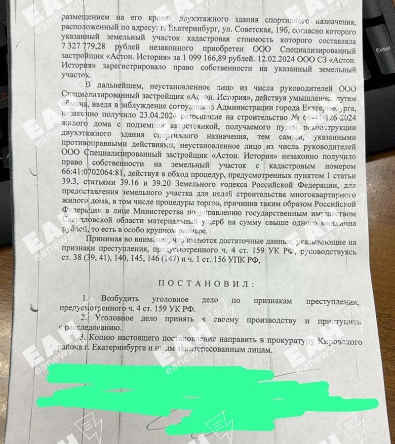 По версии следствия, участок на улице Советской в Пионерском районе компания «Астон.История» приобрела незаконно. Она получила землю за 1 млн рублей при кадастровой стоимости в 7,32 млн рублей. Потом один из руководителей девелоперской компании обманул сотрудников мэрии Екатеринбурга, чтобы построить 33-этажный жилой дом, вместо реконструкции спортивного комплекса. Кто именно ввел в заблуждение сотрудников администрации города следствие пока что не знает. Уголовное дело возбуждено по ч. 4 ст. 159 УК РФ «Мошенничество в особо крупном размере».