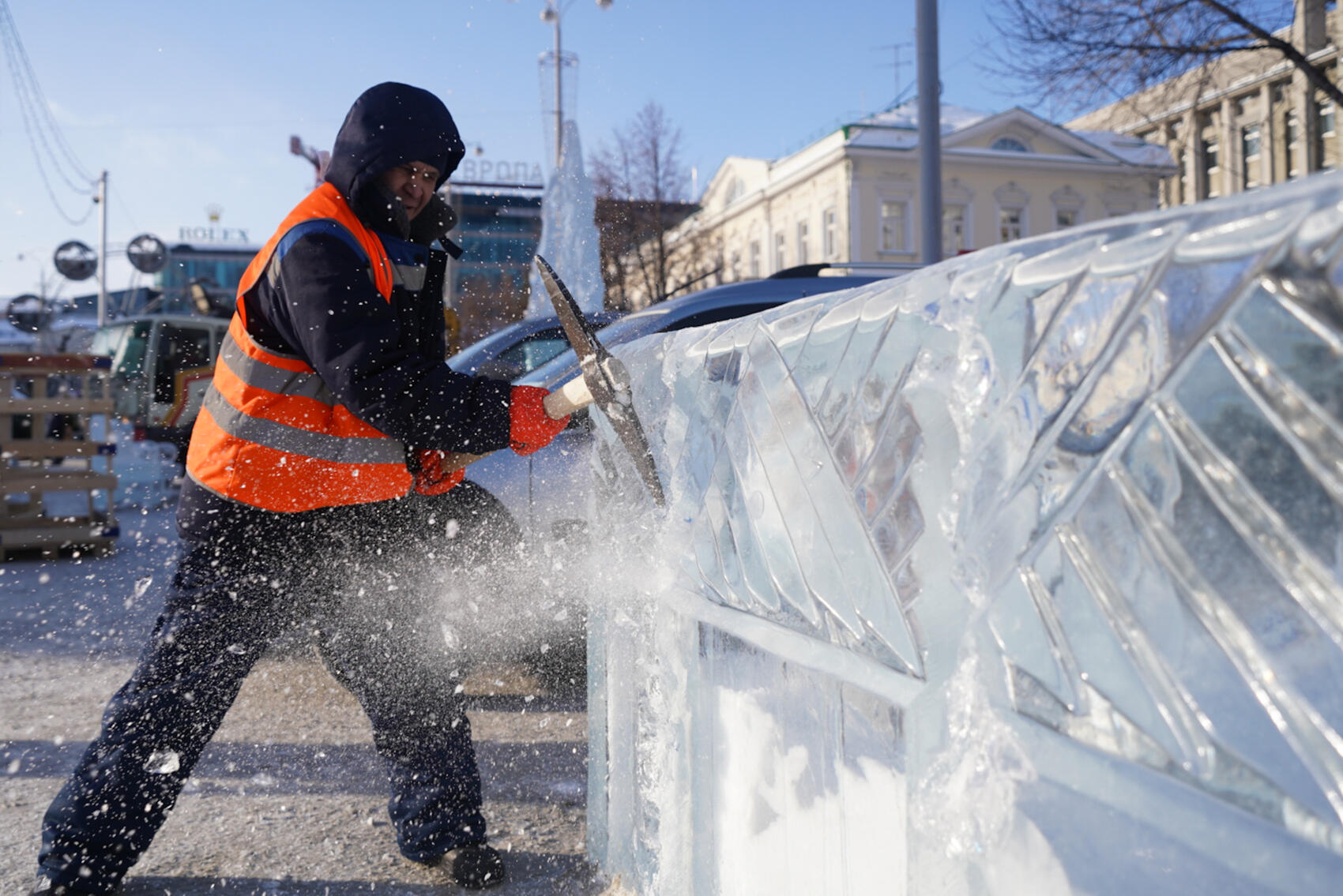 Рабочий разрушает стену ледового городка на площади, праздник уступает место будням — привычной парковке. Менее чем через год впервые в истории Екатеринбурга здесь зальют огромный каток, а новогодний городок с елкой переедет в Исторический сквер.