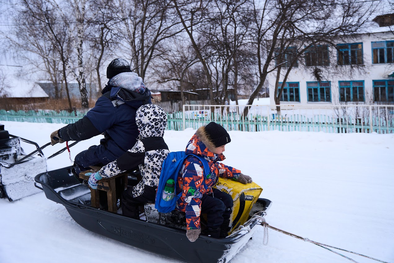 Сергей работает на вахте в другом регионе, а в свободное от смен время ездит на рыбалку на снегоходе. Улов бережно складывает в сумку курьера «Яндекс.Еды». В его санях по селу перемещается и пойманная рыба, и местные дети.