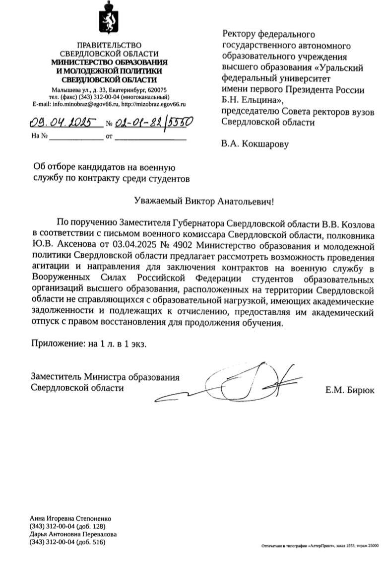 Как отмечается в письме, инициатива реализуется «в целях исполнения поручения Верховного Главнокомандующего Российской Федерации». Вовлечение УрФУ в процесс набора контрактников происходит впервые с начала «спецоперации».