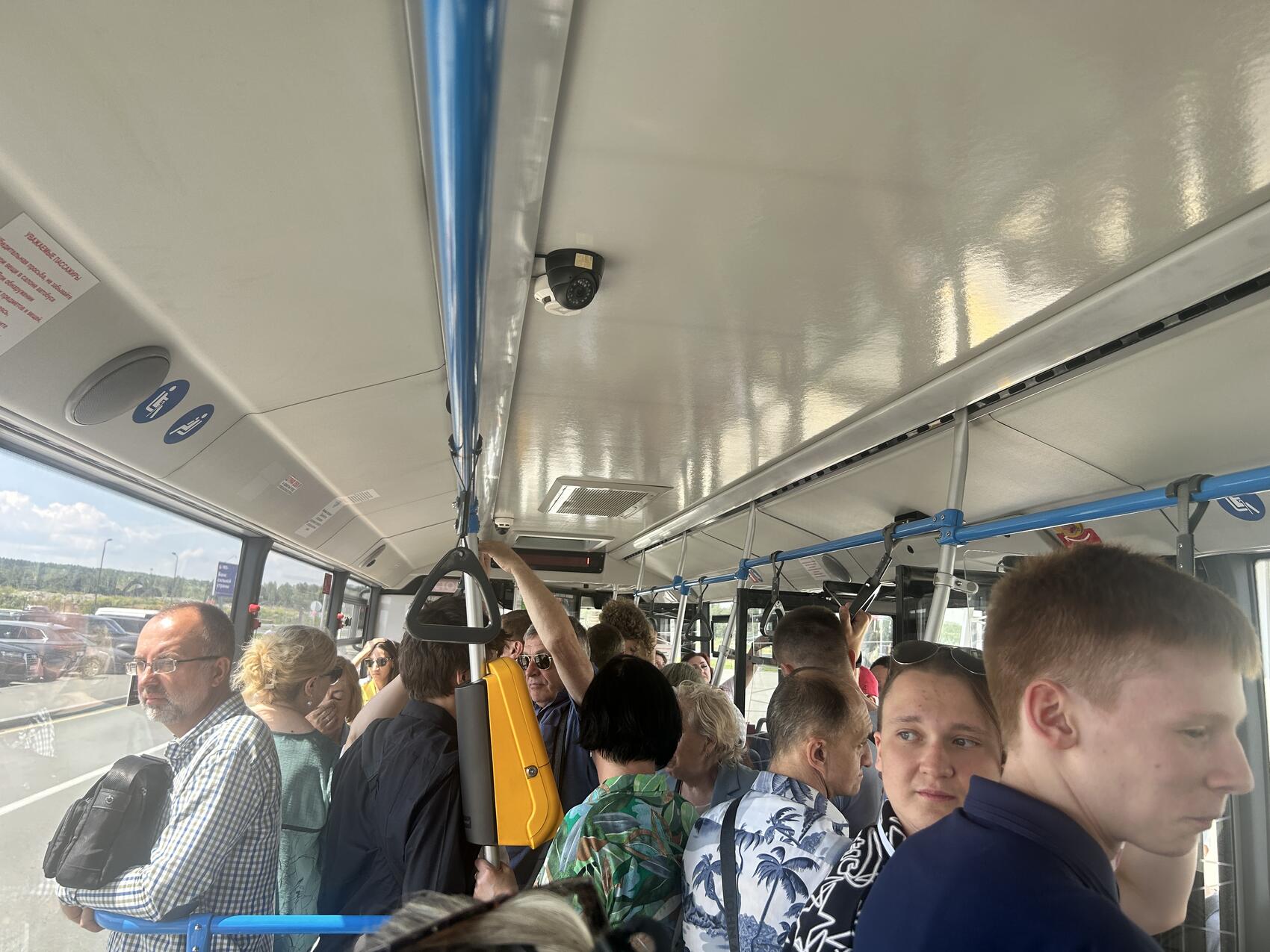 В последние два дня «Иннопрома» уехать в город стало немного сложнее. Судя по информации на сайте выставки, бесплатные автобусы отходили от станции метро «Ботаническая» и от остановки в «Екатеринбург-Экспо» каждые 15 минут, что и соблюдалось 7 и 8 июля. По какой-то причине 9 и 10 июля шаттлы стали ходить реже. Из-за этого на остановках в часы пик скапливалось много людей, а автобусы были забиты почти битком.