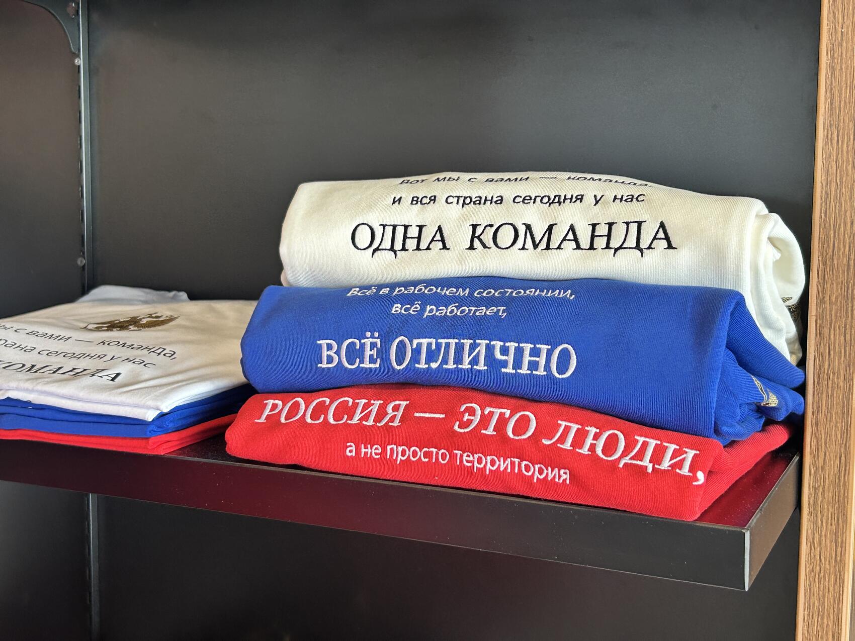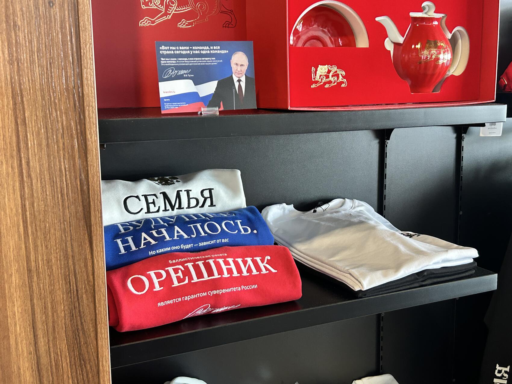 Между третьим и четвертым павильоном работал универмаг национального центра «Россия», в котором продавали товары из разных регионов страны. Помимо продуктов, посуды, украшений для интерьера здесь можно было найти мерч центра — одежду с цитатами Путина. В том числе с высказыванием про знаменитый «Орешник».