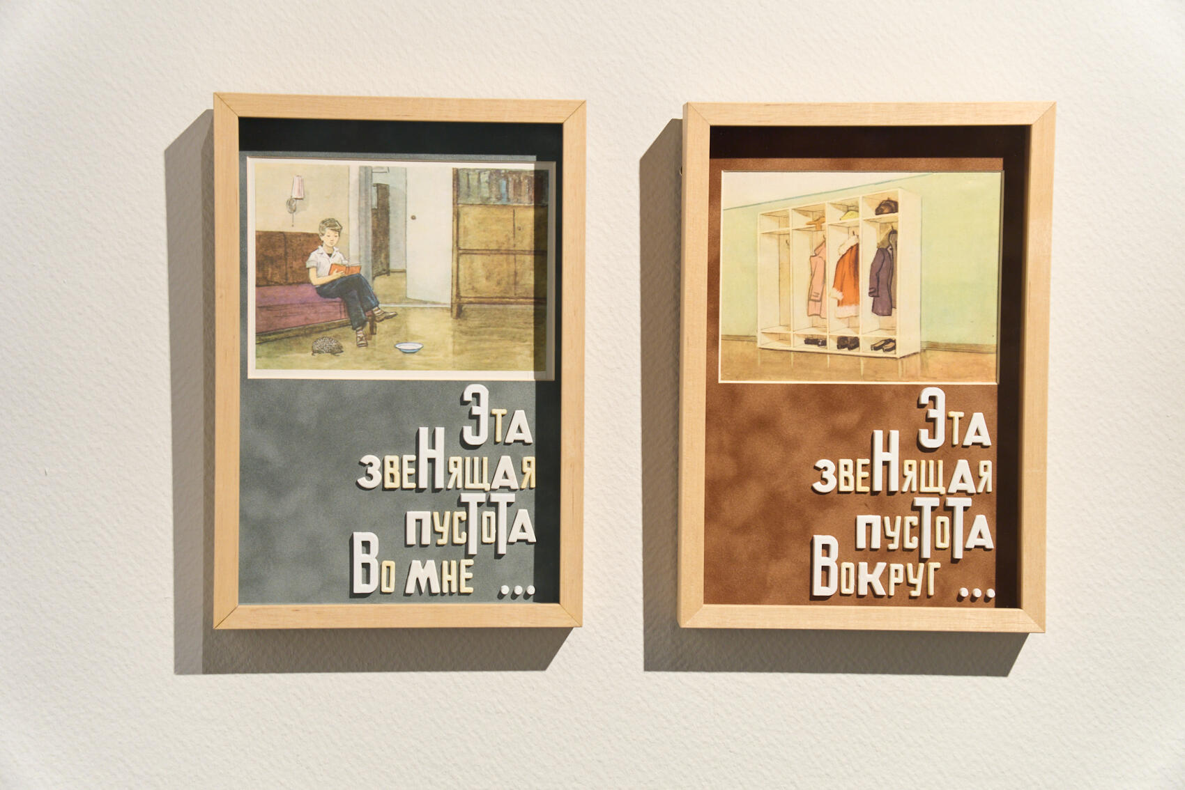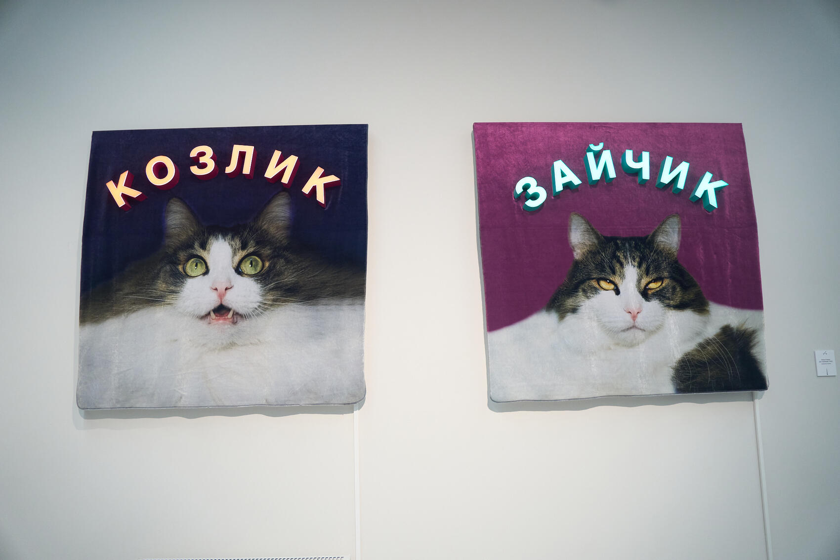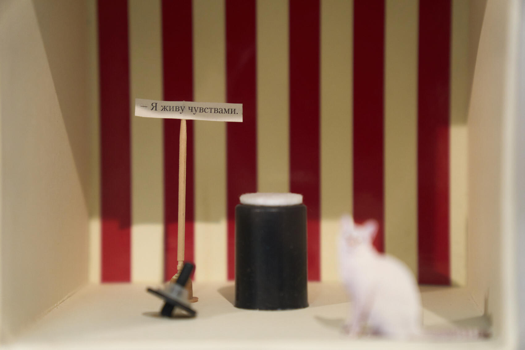 Галина Шубина и Петр КирюшаЯркой деталью выставки стали кошки Алины Глазун. Ее ранние работы — это «коробочки» с историей внутри, где случайные фразы из журналов соседствовали с образами котов. Но за кажущейся простотой и иронией скрывается глубина. Ее арт-объекты — это всегда шифр, множество закодированных историй и отсылок.