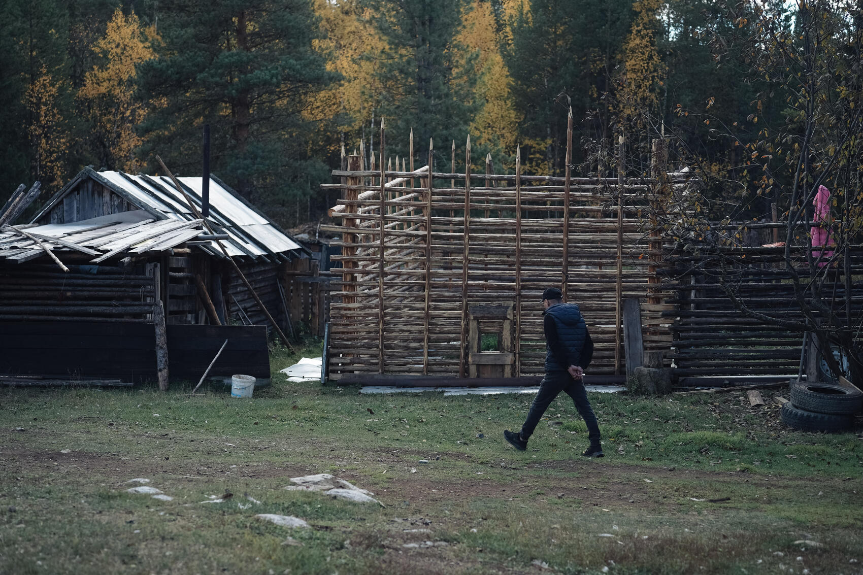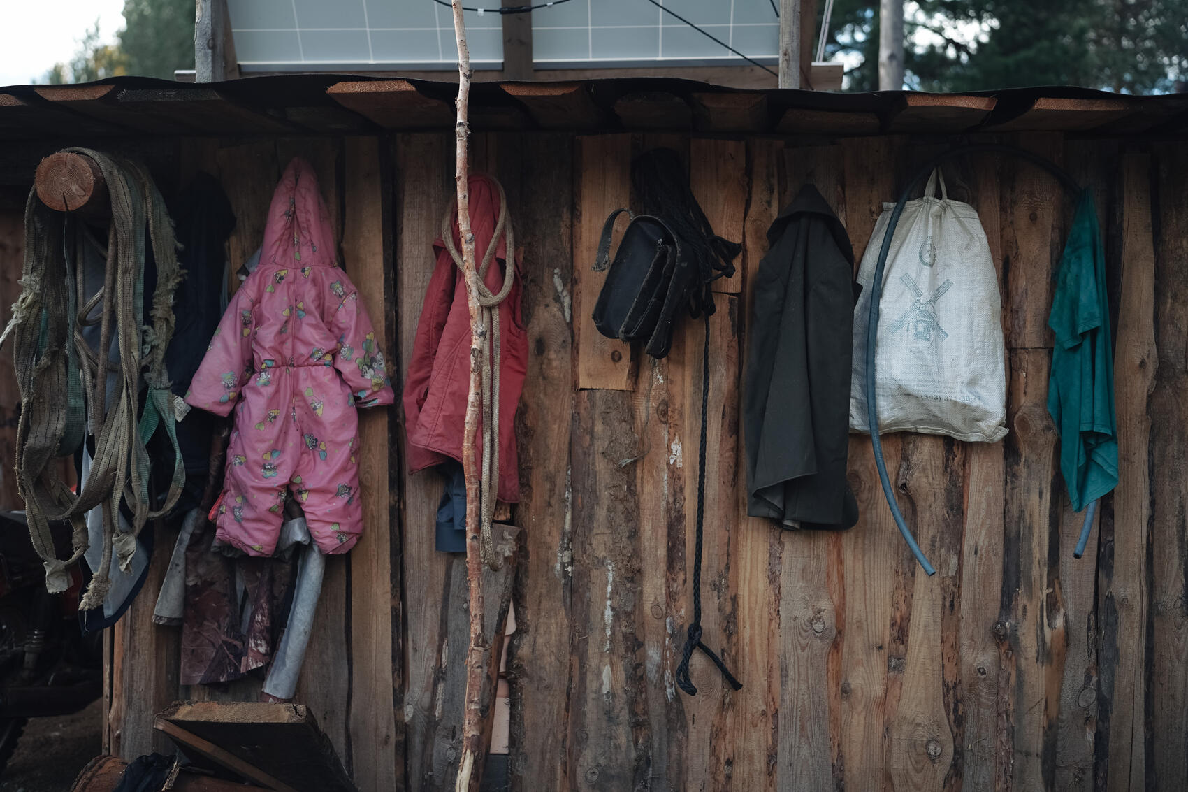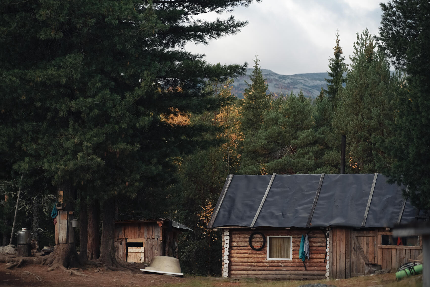 Рядом с летней кухней стоит сколоченный из досок маленький одноэтажный охотничий домик — воркол на языке манси. Около домика поленница дров и штабеля мешков с кедровыми шишками. Невдалеке установлена панель солнечных батарей — источник электричества для сезонного жилья.