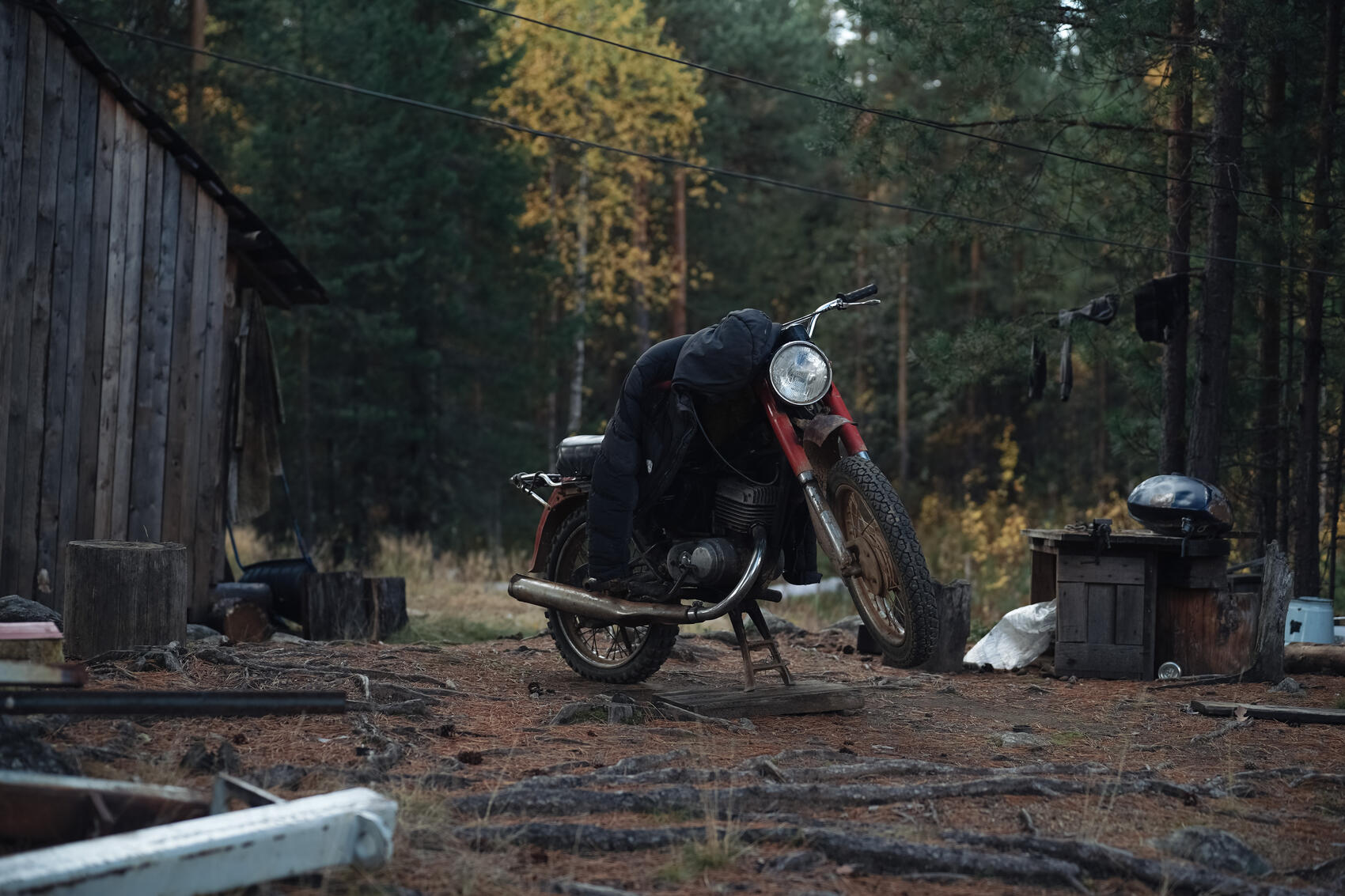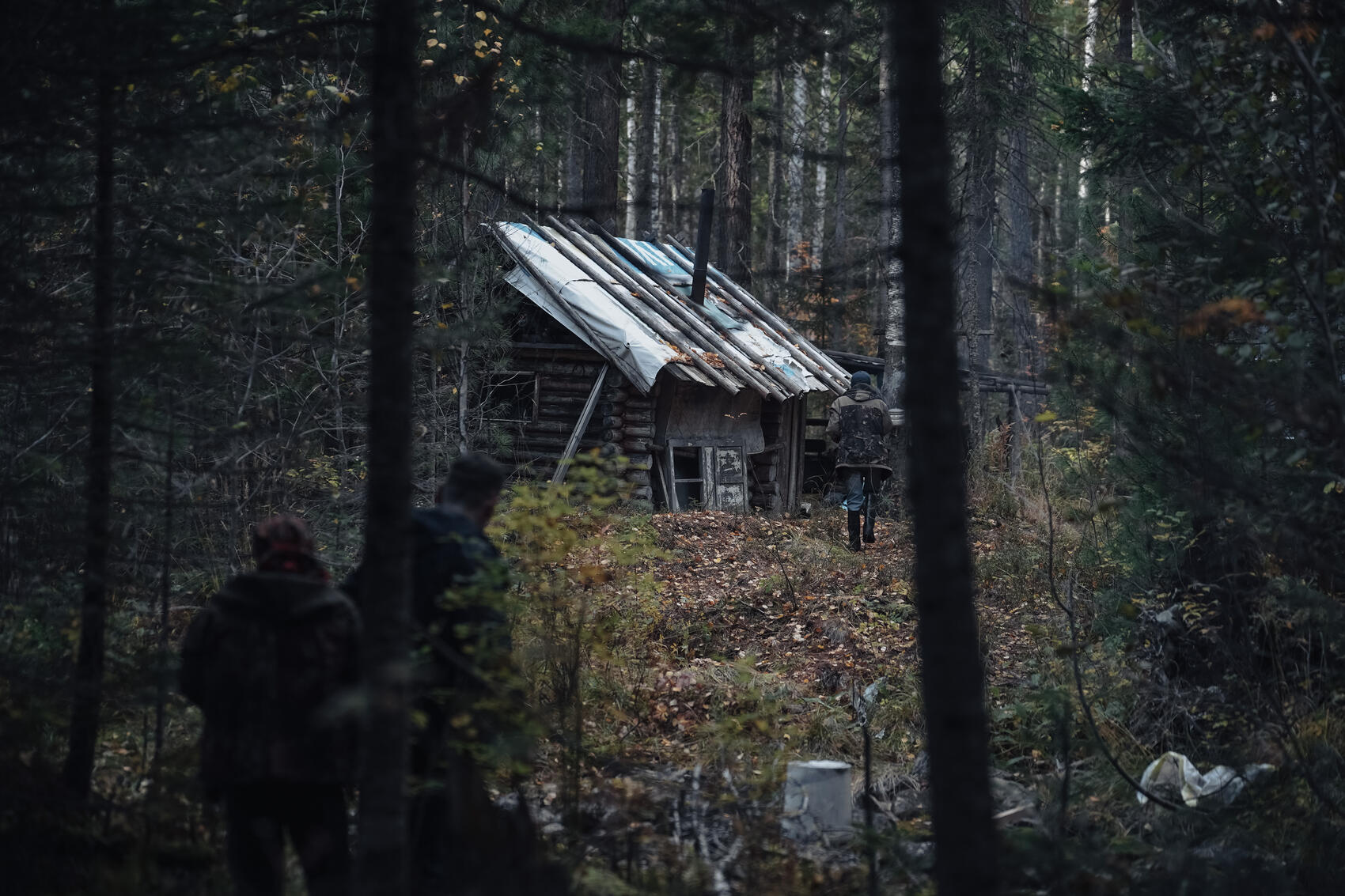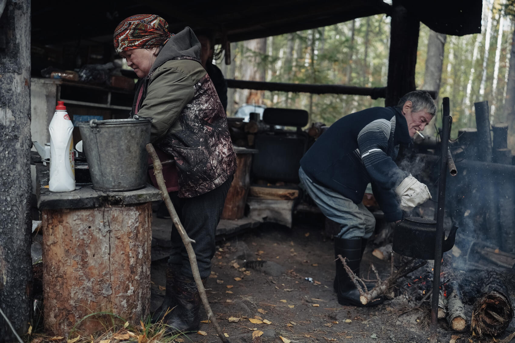 Алексей сидит на стуле под навесом летней кухни. Его жена Марина, невысокая улыбчивая женщина, разливает чай из закопченного чайника, только что снятого с открытого очага. На кухонном столе среди металлических мисок и кружек рассыпаны пакеты лапши быстрого приготовления. У стола крутится добродушный серый охотничий пес Тэхам (на мансийском «товарищ»).